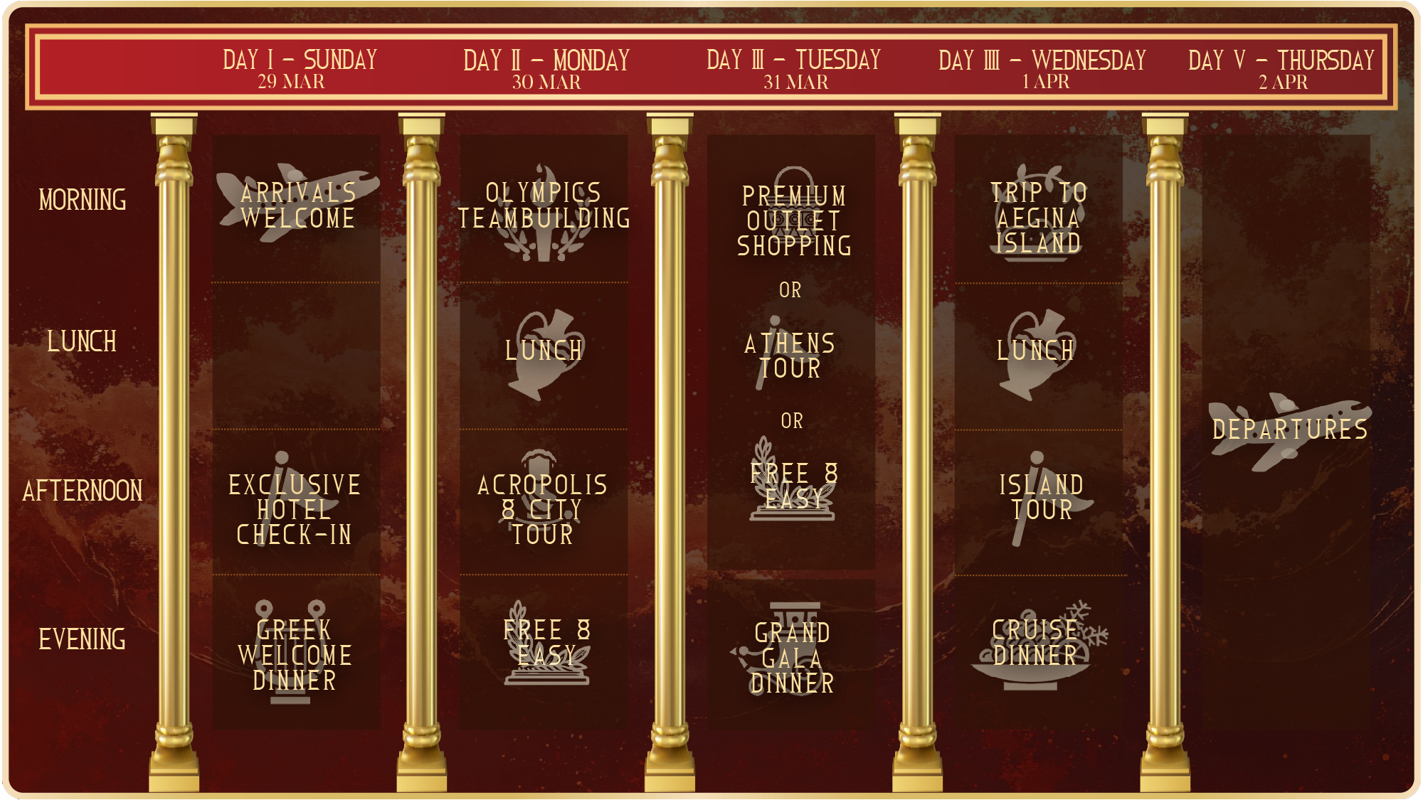 - All participants are assigned a single-occupancy room at the Hotel Grande Bretagne, Athens.